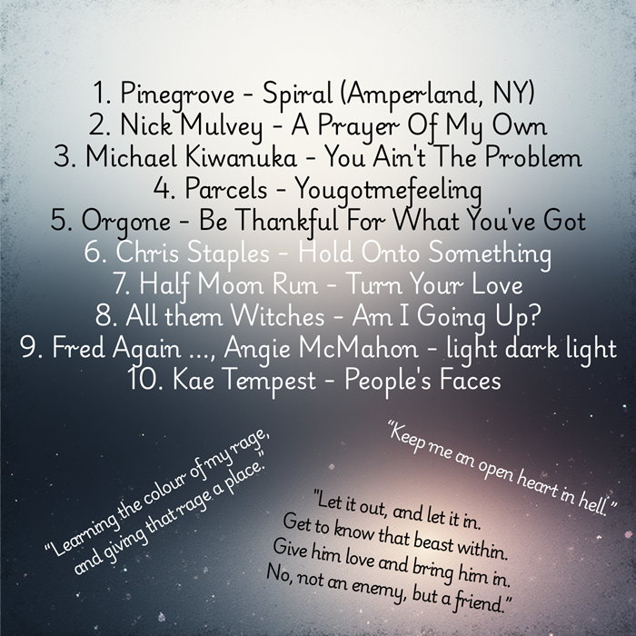From there, it’s a glorious journey of lyrics and sounds that talk to a glimmering process of healing. There are familiars, like Michael Kiwanuka and Angie McMahon. And new finds like the youthful Australian (then German) outfit, Parcels, and the unspeakably groovy Orgone. All of this before winding down with some sweet melodic rock and ending with a skillfully emotional narrative on collective resilience and the failings of late-stage capitalism, by Kae Tempest. So yeah, it probably can’t be considered a light mix, but there is gleaming light within it, I promise.